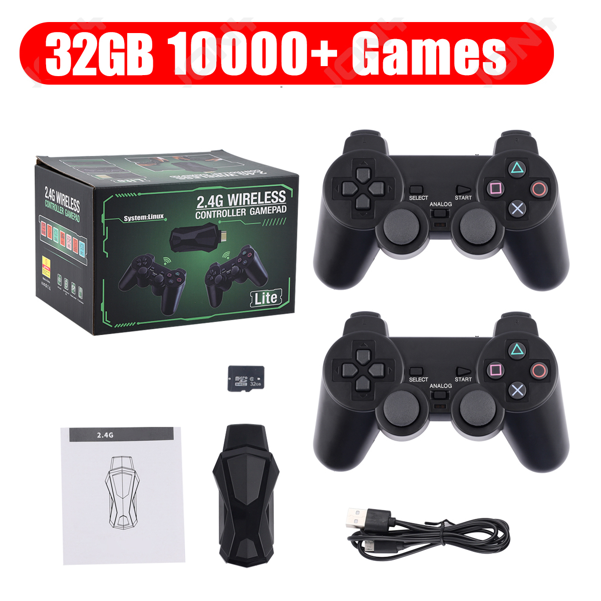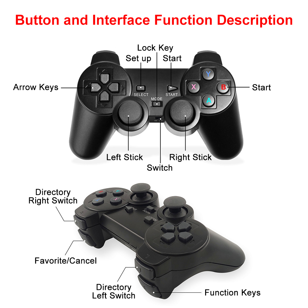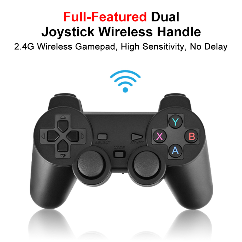 2.4GHz wireless controller: equipped with two 2.4G wireless gamepads. It can support up to 4 players at the same time, and you can remotely control and enjoy the game on the sofa with your family or friends.9 emulators,